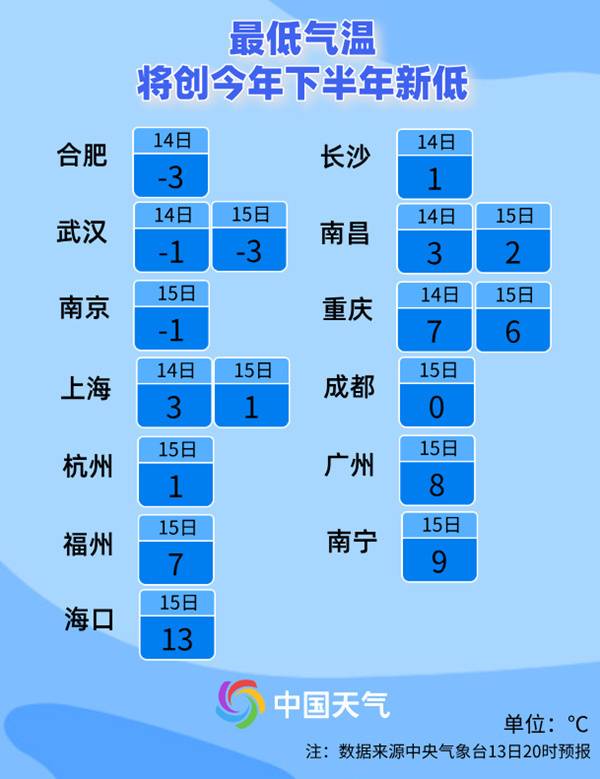 这个周末,南边多地也将渡过本年下半年来最冷清晨,一些城市最低气温还将连转变低,长江中下贱到贵州中北部一带多地最低气温将跌破0℃。